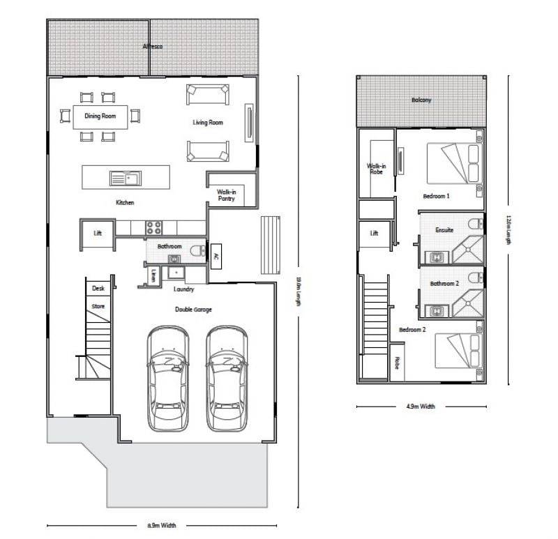 Glenfern Community Generous two-level design with a spacious alfresco entertaining area. King-sized master suite with walk-in robe, ensuite and balcony. Large kitchen with island and quality appliances. Open plan light-filled entertaining living and dining spaces. Lift for easy access. Study or multipurpose room. Guest bedroom with built-in robe and separate bathroom. Internal laundry. Fluid indoor/outdoor interaction.