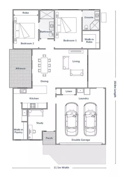 Generous single-level design with a spacious alfresco entertaining area. Master bedroom with walk-in robe and en-suite bathroom. Large kitchen with huge butlers pantry. Open plan light-filled entertaining living and dining spaces. Light filled study or multipurpose room. Guest bedroom with built-in robe and separate bathroom. Dormer window harnessing sunshine. Fluid indoor/outdoor interaction