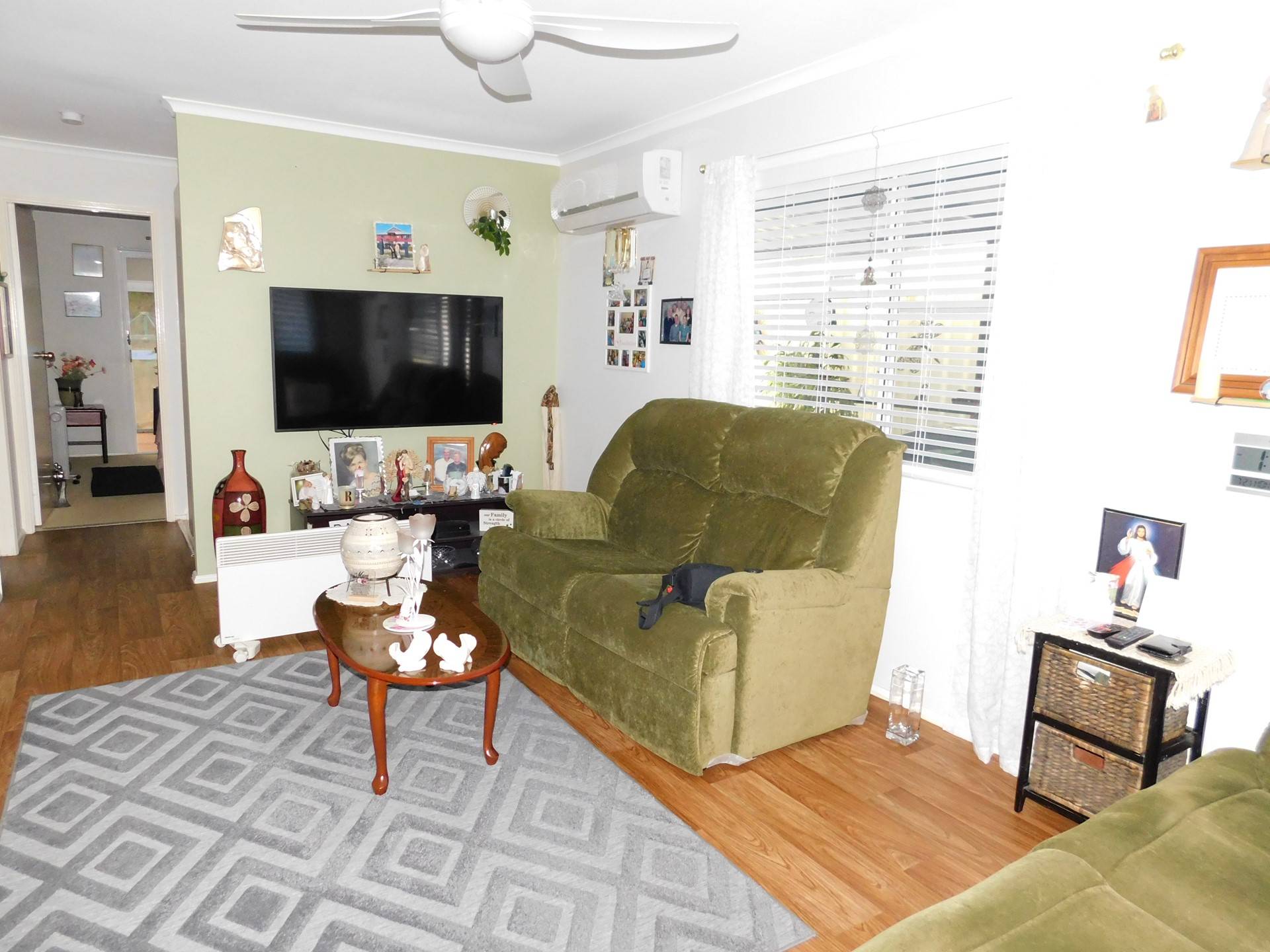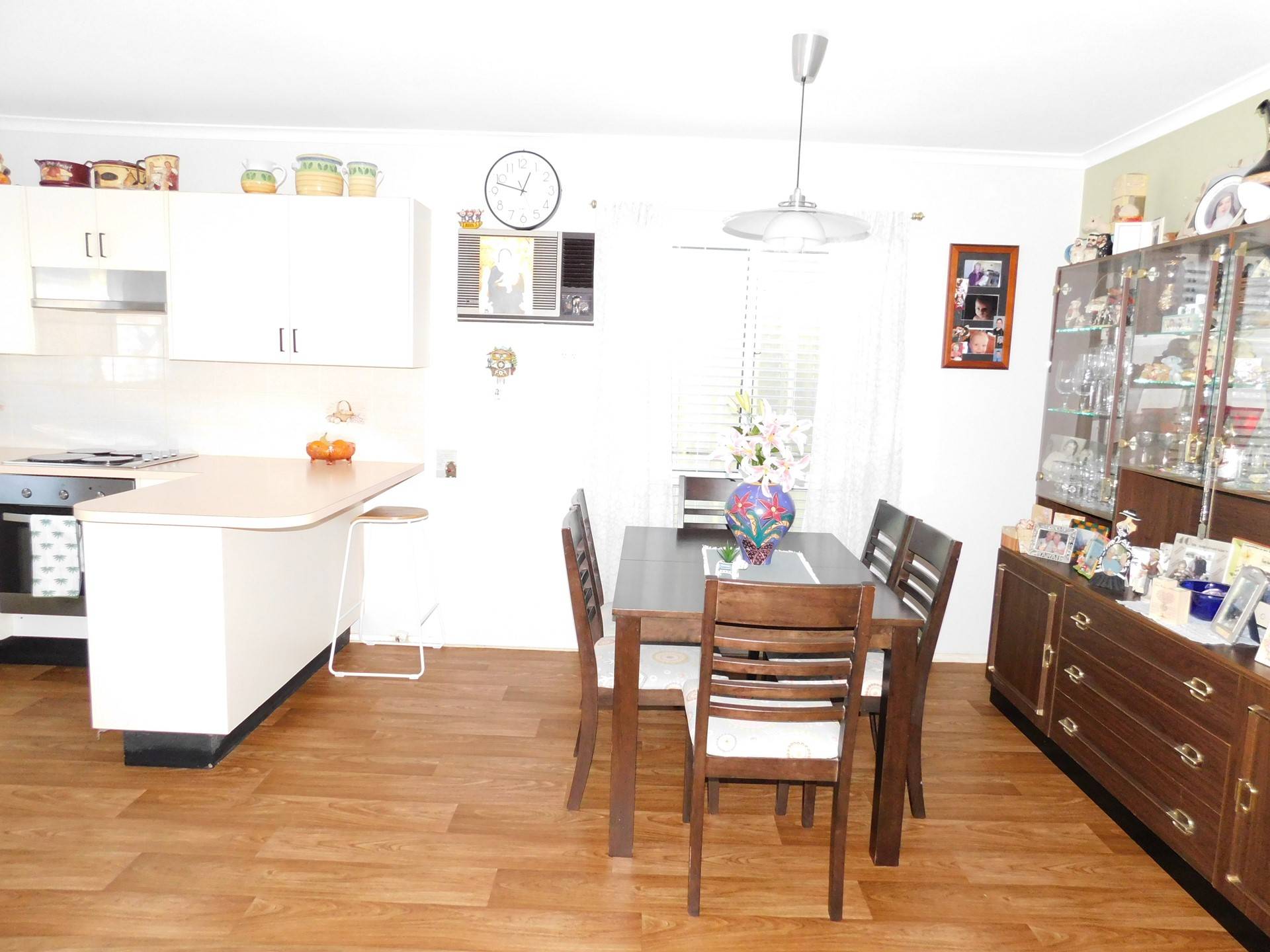 Step inside to a spacious open-plan layout featuring a well-appointed kitchen with ample bench space and storage. The adjoining living and dining area is enhanced by timber-look flooring and reverse-cycle air conditioning, creating a comfortable and inviting heart of the home.