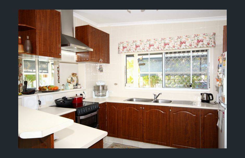 The kitchen has plenty of storage and cupboard space with cream coloured laminate bench-tops and 2-Pak rosewood profile doors, complemented with a stainless steel Bellissimo stove, double sink and tiled splash-backs.