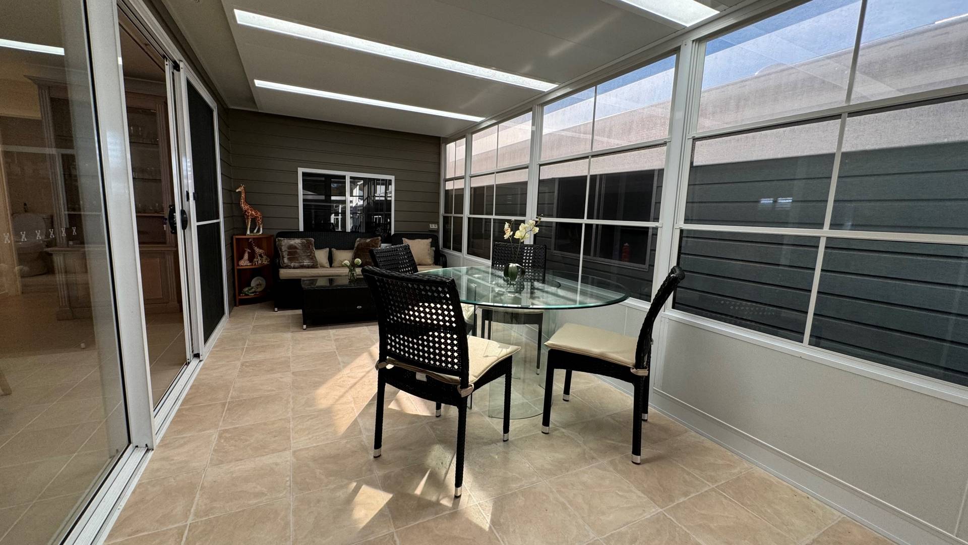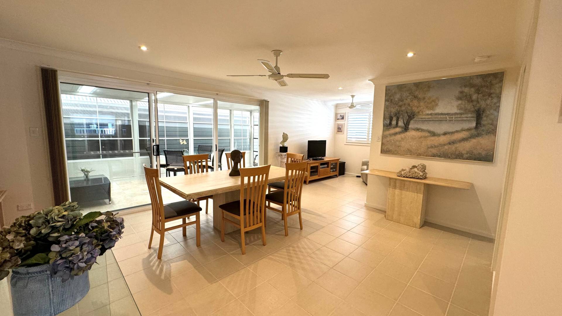 The fresh open plan living area offers tiled flooring, air conditioning, ceiling fans, gas heating (heater included), separate dining area and study nook.