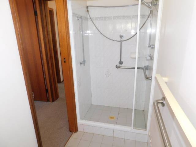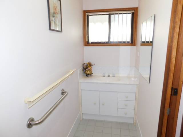 The bathroom has a large shower fitted with safety handrails & the toilet is separate.