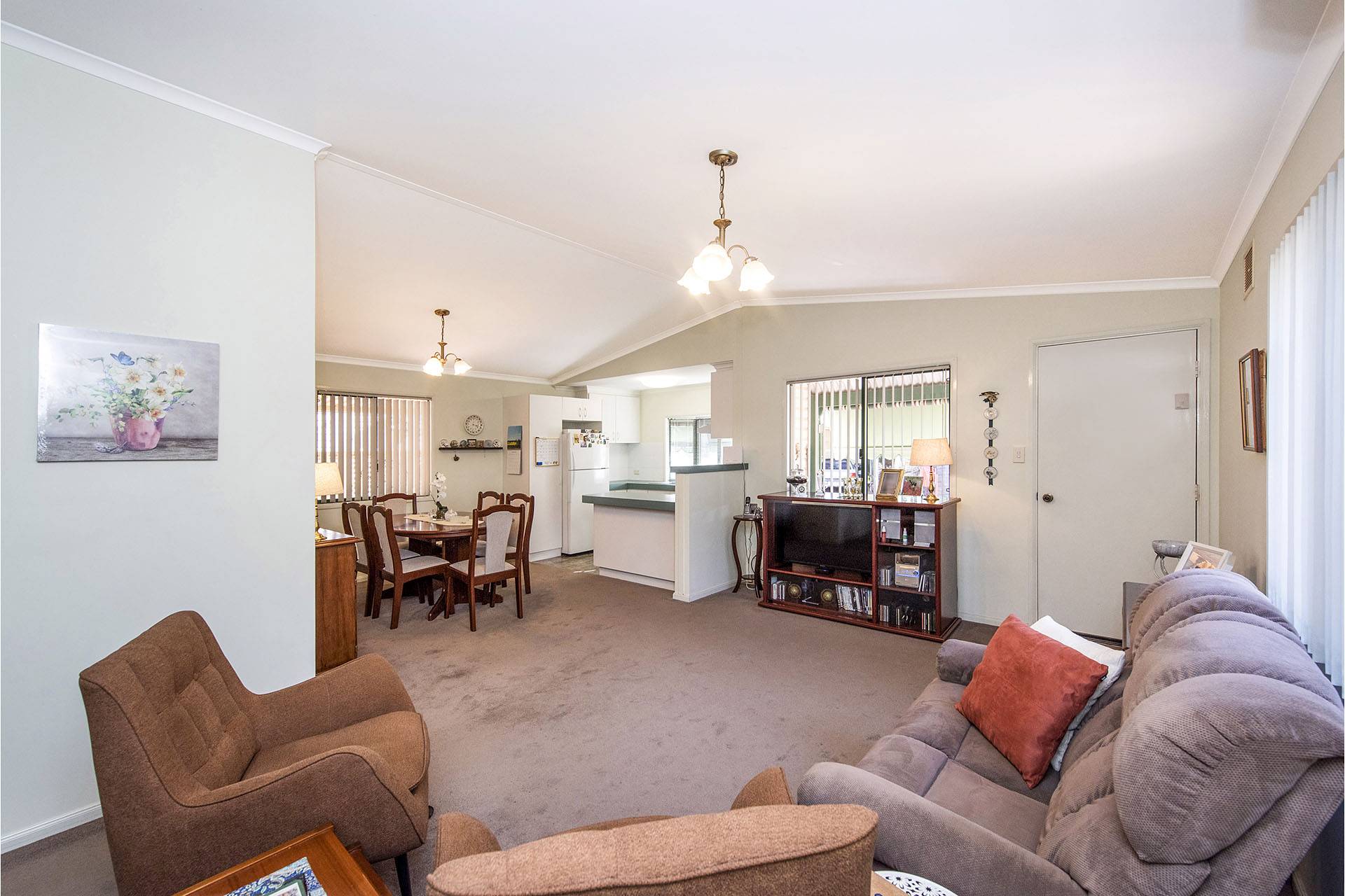 Features includes open plan living, with a spilt system air conditioning in living. Carpet flooring throughout, floor tiles in bathroom, laundry and separate toilet. Vertical blinds, and security screens on windows. Kitchen includes gas cook top, oven and rangehood.